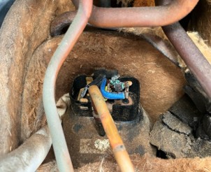 📸 写真上↑ コンプレッサー上部の端子に接続された配線が青緑色に変色しており、腐植による導通不良が懸念される状態でした。