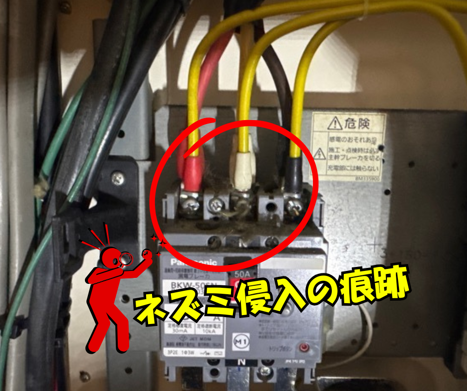 ある現場で「ブレーカーの不具合がある」とのご相談をいただき点検を行ったところ、ブレーカー内部にネズミが侵入した痕跡を確認しました。